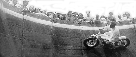 At the southeast corner of the first promenade was the Motordrome, or "The Wall Of Death", where motorcycle daredevils rode the walls of a huge wooden barrel. Their speed kept them up on the wall until they were ready to come slowly down.